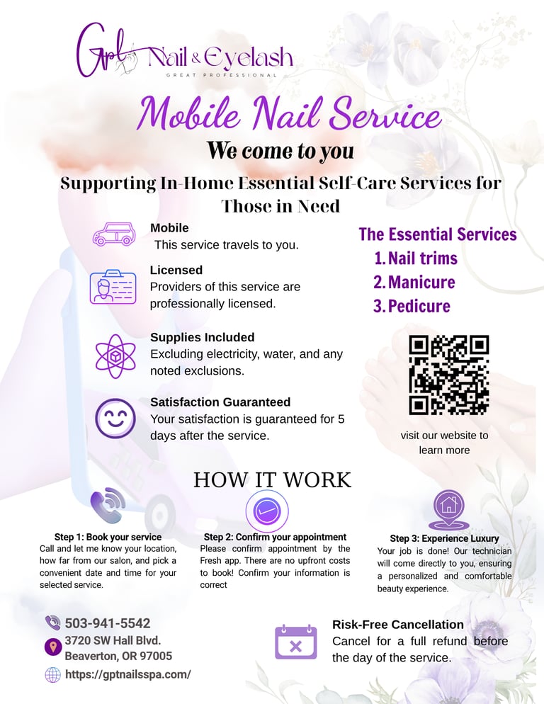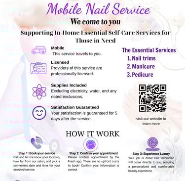 Technicians with experience in caring for fragile individuals will provide a comprehensive fingernail & toenail care package, which includes nail trim, shape, foot bath, scrub, cuticle care, moisturize & optional regular polish.